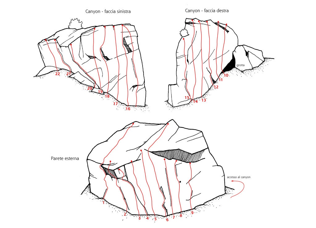La parete è relativamente giovane, è necessaria un po’ di attenzione per la presenza di alcuni blocchi ancora instabili (consigliato l’uso del casco).